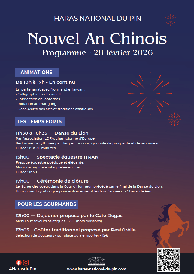Le samedi 28 février 2026, le Haras national du Pin s’illumine au rythme de la culture asiatique et de l’excellence équestre pour une journée unique : émotions, traditions et magie seront au rendez-vous.