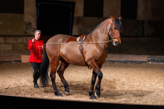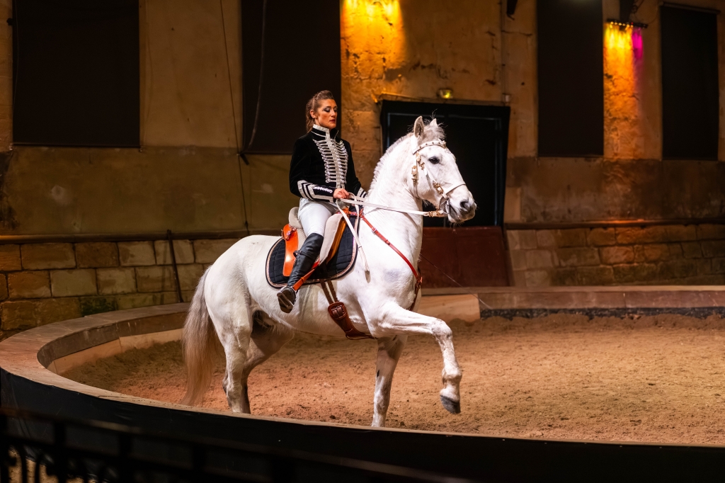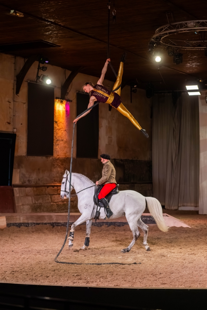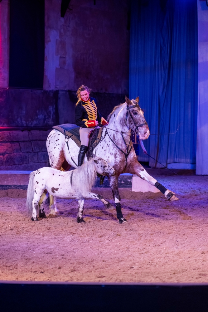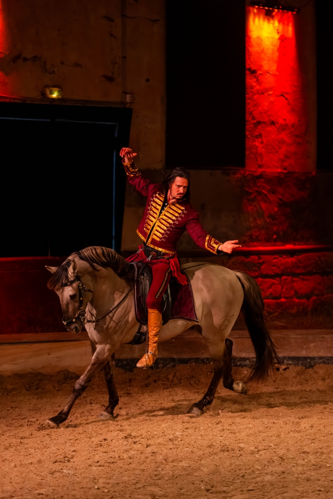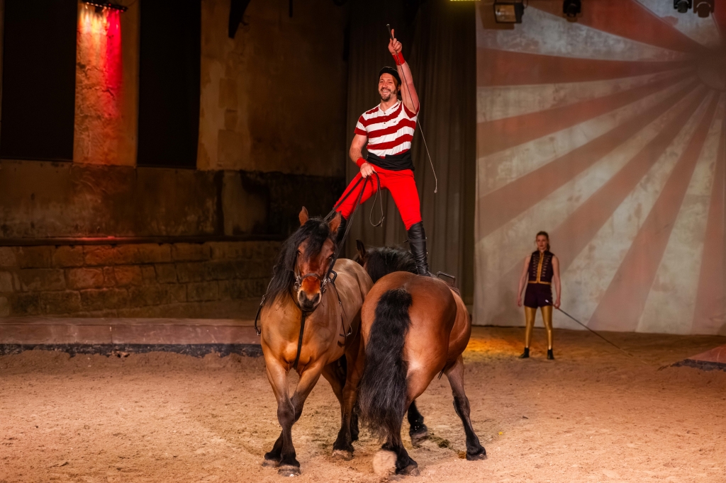 Le spectacle s’ouvre sur cette transformation fondatrice, faisant écho à l’histoire même du Haras national du Pin, lieu d’excellence et de transmission du savoir équestre.